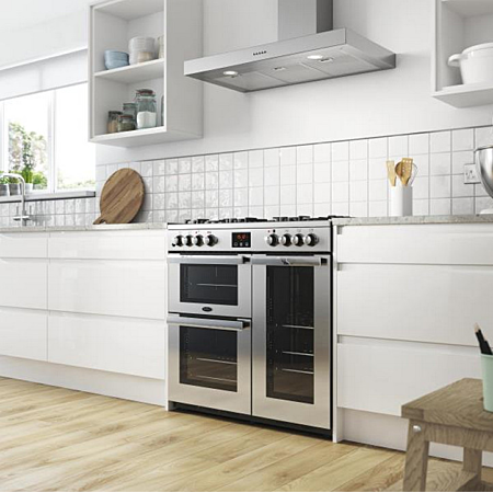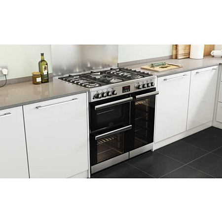 Piano de cuisson Belling Cookcentre 90DFT – 90 cm, 5 foyers gaz, 3 fours électriques (177 L), design noir inox, gril 1850 W, chaleur tournante. Élégance, puissance et performance britannique.